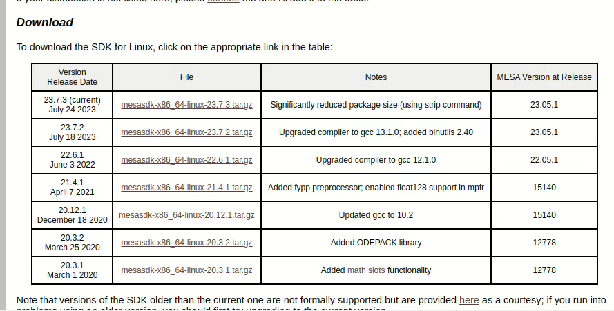 MESA sdk 一般下载最新版,也可以按照所需MESA版本找到对因的sdk版本