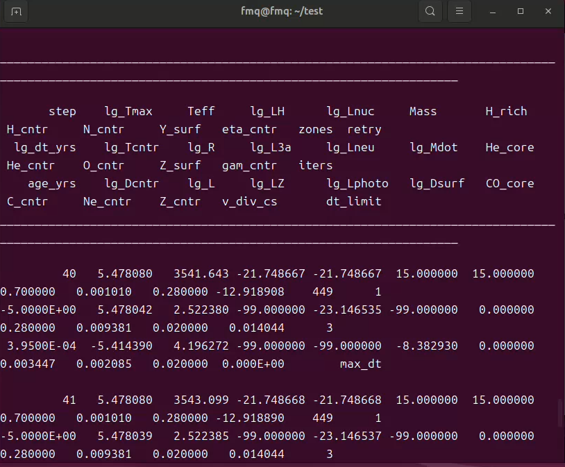 出现这个界面,就代表MESA已经成功安装,终端上是恒星演化过程中的部分参数。