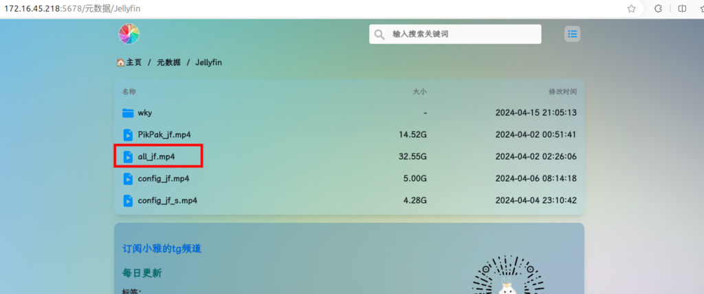 到xiaoya主页/元数据/Jellyfin中找到all_jf.MP4文件,直接下载或播放一次后在阿里云转存文件中下载