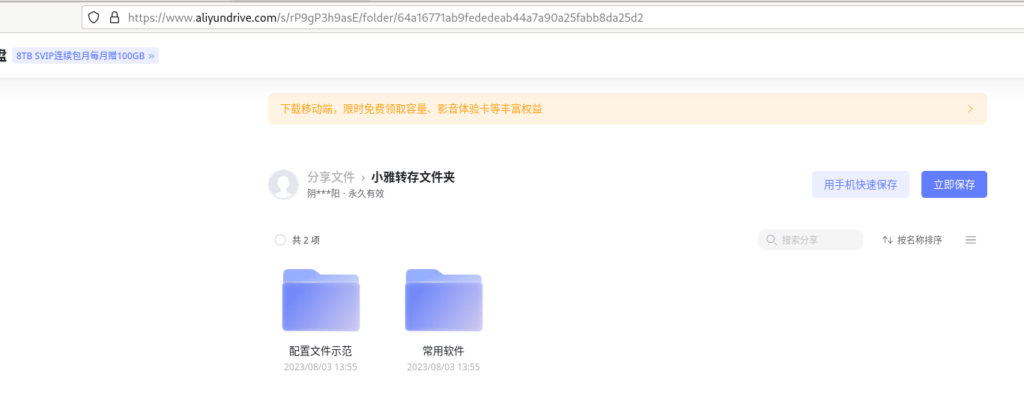 获取转存目录的目录id:先转存https://www.aliyundrive.com/s/rP9gP3h9asE到自己的网盘,进入转存的目录,上面地址栏中folder/后面的数字就是转存目录id