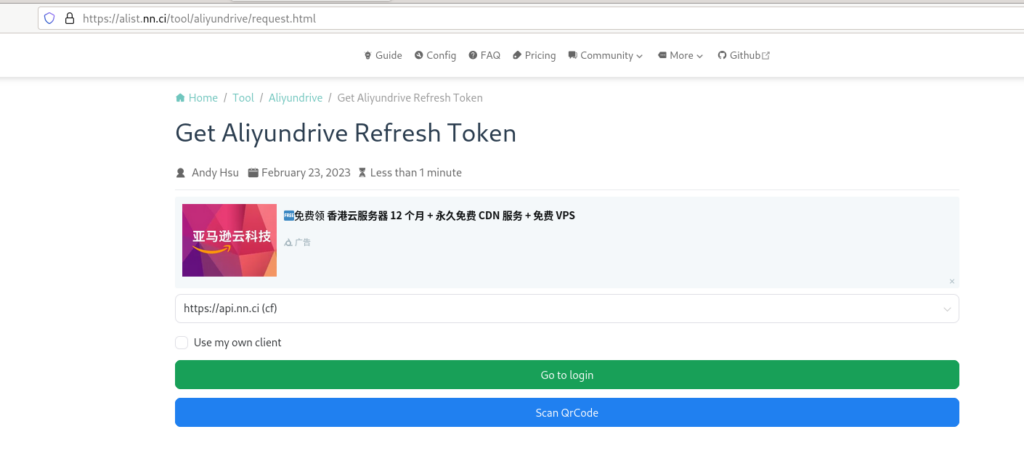 阿里云盘的open token在https://alist.nn.ci/tool/aliyundrive/request.html,点击蓝色的scan QrCode出现二维码,使用手机app扫码,再点击I have scan获取128位的token